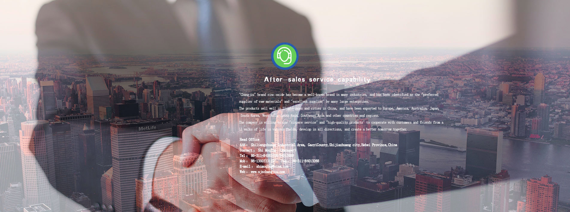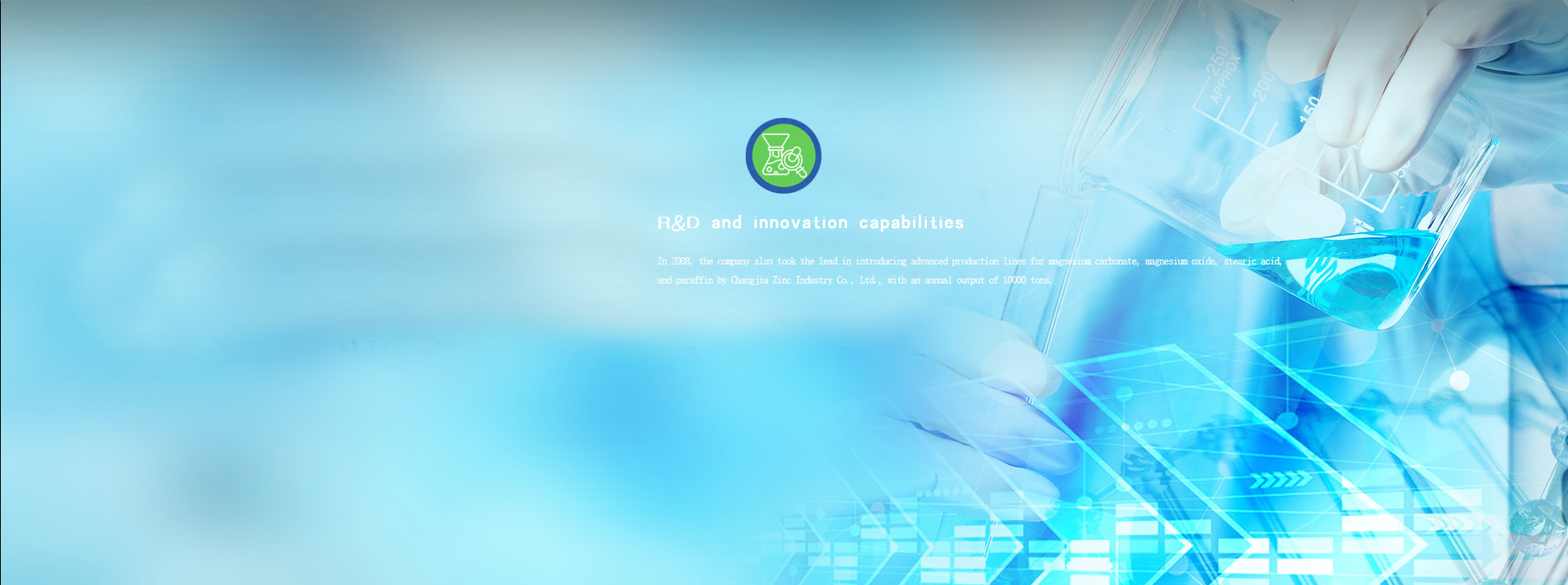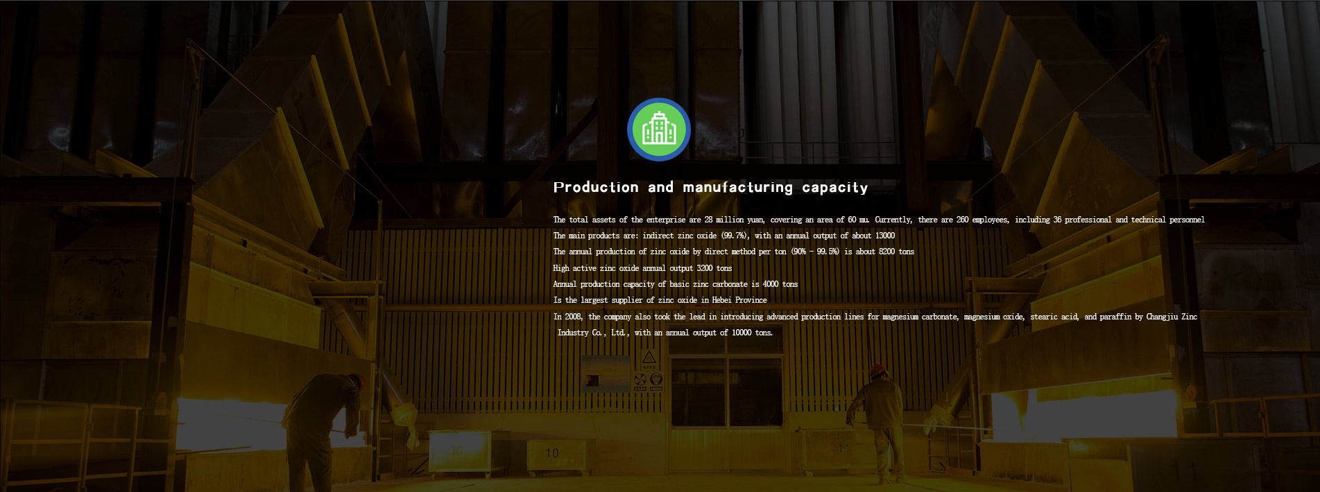 At present, it has total assets of 28 million yuan, an area of 40,000 square metres . and 130 employees (including 16 technicians). Our products include indirect process zinc oxide (99. 7%) with annual capacity of 10,000 tons, direct process zinc oxide (90% 99. 5%) , with annual 5,000 tons, and high active zinc oxide with annual capacity of 3,000 tons, Basic Zinc Carbonate with annual capacity of 3,000 tons and it is the Quality supplier of zinc oxide in Hebei province. Since 2008, the company also takes the lead in the advanced production lines introducing magnesium carbonate, magnesium oxide, stearic acid, paraffin wax,the annual output of 6,000 tons.